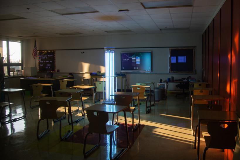 ↑优必选紫外线消毒机器人ADIBOT(净巡士)上岗美国特拉华州学校