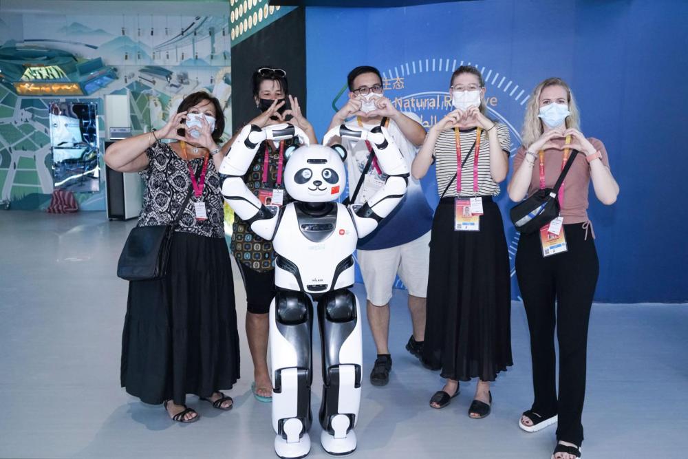 熊猫机器人优悠也是中国馆的超人气展项,拥有41个“关节”的它能打太极,表演国风书画才艺,憨态可掬的形象引得嘉宾纷纷与它互动,掏出手机拍照和录像。