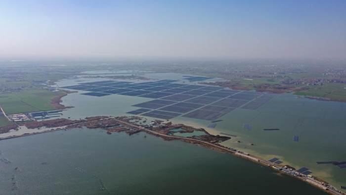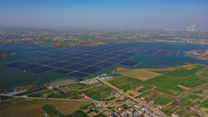 本次实现并网的是阜阳基地项目一期古城25万千瓦漂浮式光伏电站。据介绍,阜阳基地项目所包含的光伏电站规划用地全部为采煤沉陷区闲置水面,以“以光养水,净水养绿,水光互补”为原则,通过合理布局抑制藻类过快繁殖,在常规发电收益基础上结合“渔光互补”模式发展渔业养殖,实现水体环境改造,构建具有自我调节能力的浅水湖泊水生态系统。